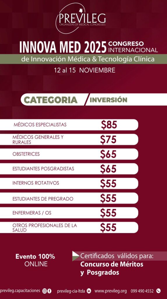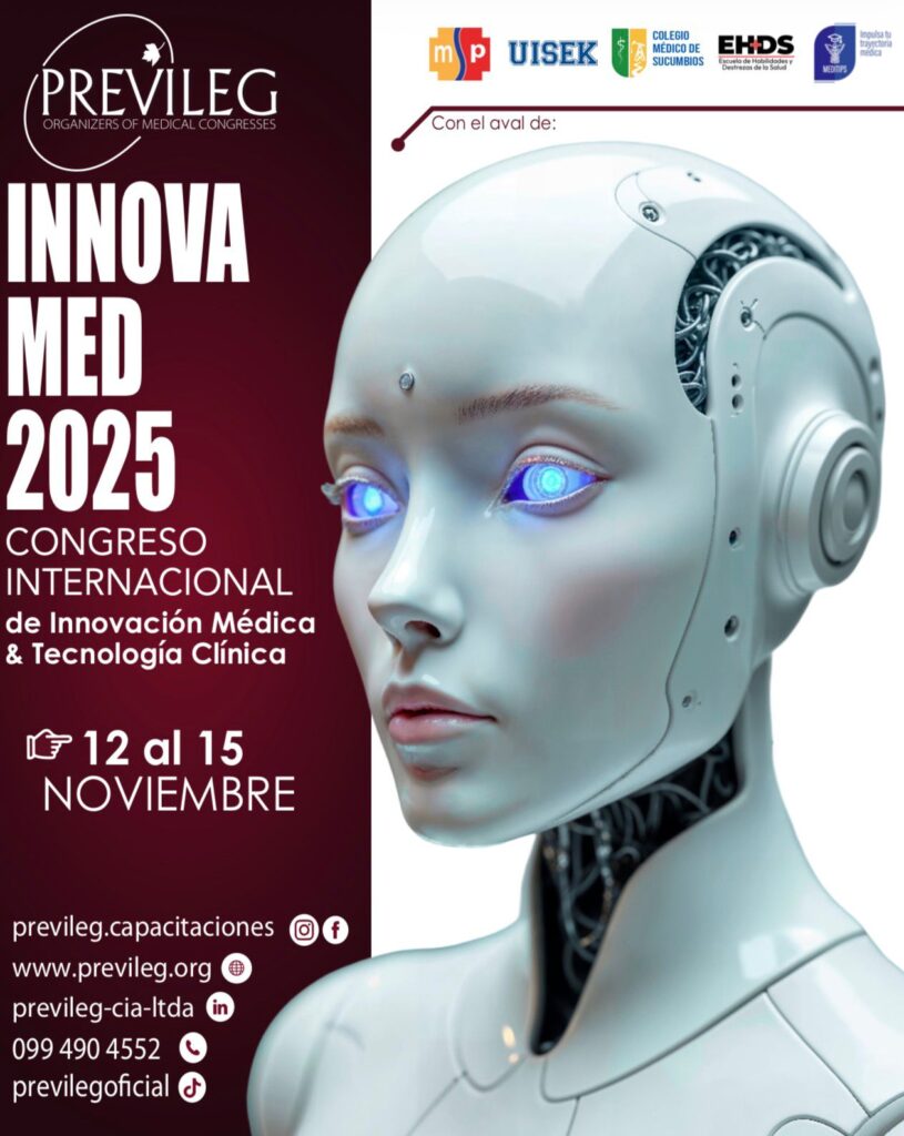 El Congreso “INNOVAMED 2025” es un Congreso Internacional de Innovación Médica y Tecnología Clínica. Se realizará del 12 al 15 de noviembre de 2025 y será de modalidad 100% online. Este congreso está siendo avalado por UISEK, MSP, EHDS, MediTips, Escuela de Médicos de Sucumbíos y PREVILEG.