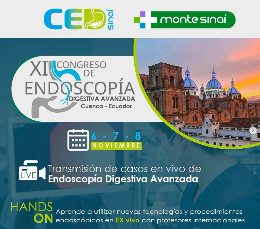 El “XI Congreso de Endoscopía Digestiva Avanzada” está siendo organizado por el Hospital Monte Sinaí y se realizará del 6 al 8 de Noviembre, en el Hospital Monte Sinaí Auditorio Torre IV, la ciudad de Cuenca.
