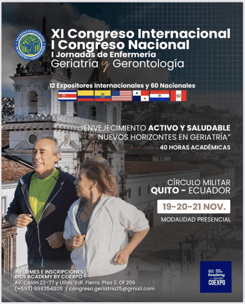 El “XI Congreso Internacional de Geriatría y Gerontología” y el “I Congreso Nacional de Geriatría y Gerontología” se realizará del 19 al 21 de Noviembre, en la ciudad de Quito, en el Círculo Militar.